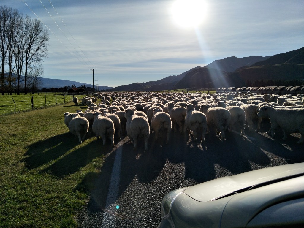 Part of the drive to Mount Cook was interrupted with a serious traffic jam: sheeps blocking the road! It was really a refreshing experience being in a traffic jam with sheep crossing from the right side of the road to the grass patch ahead on our left. There was also a dog rounding them up.
