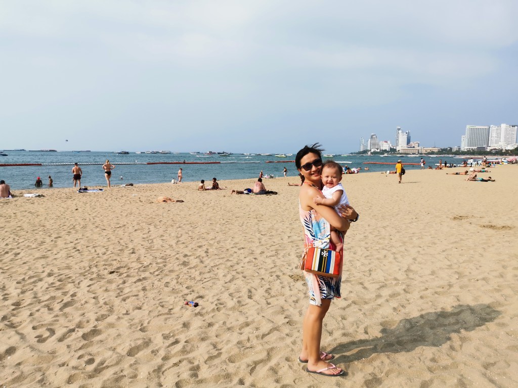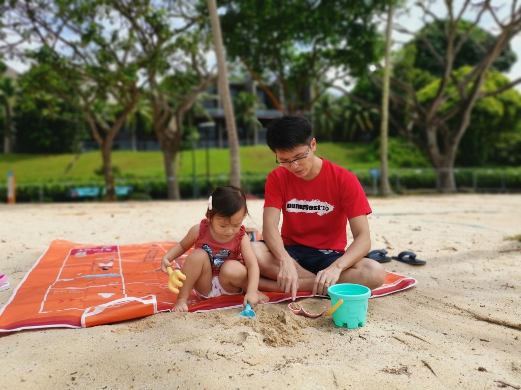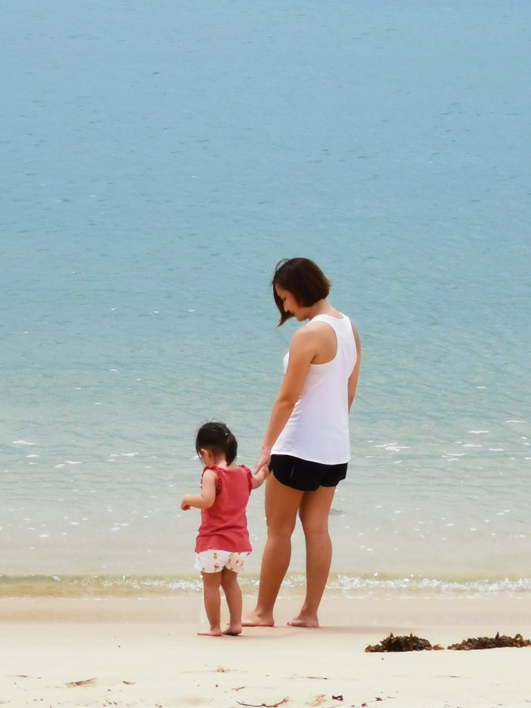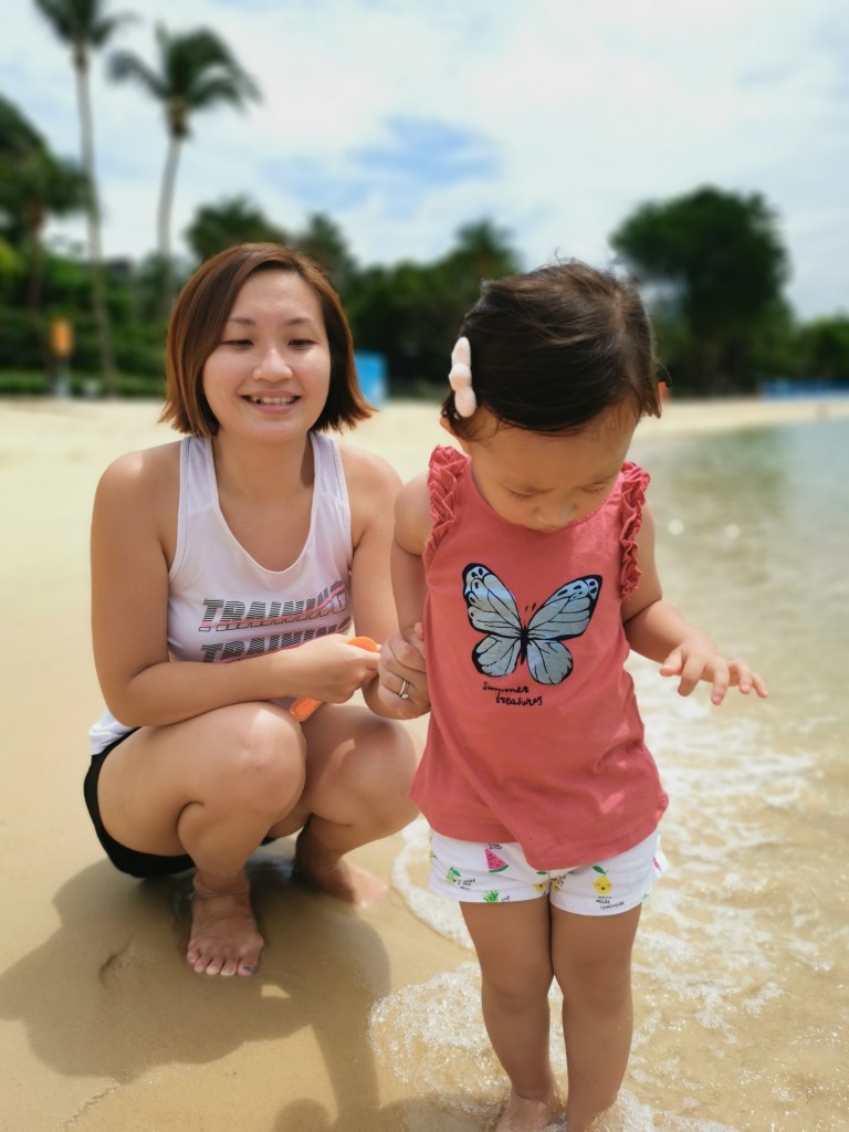 Although the sky was gradually turning cloudy, we decided to make a quick trip to the beach for some sandcastle time! Our girl used to be afraid of stepping on sand and now she enjoys it! She was even able to slowly walk down the beach to have a dip in the sea!