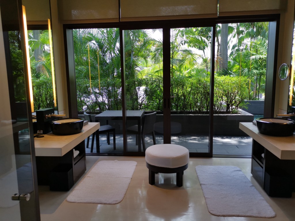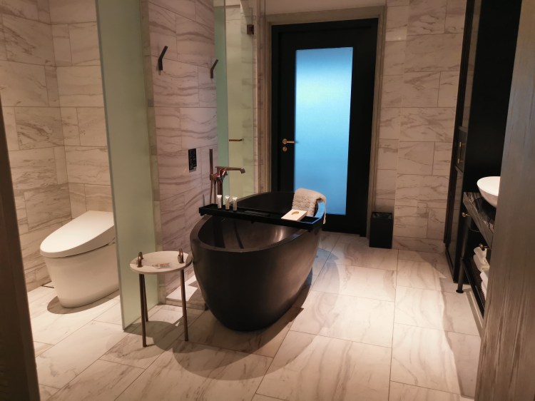There are only 40 guest rooms in this hotel. Hence, it has a very cosy intimate feel and staff addressed our girl by her name. On our way to our room at level 2, the staff who walked us up introduced us to the building’s history and amenities in the room. I love the fittings of the room which mainly came in rose gold hues. What I love most is the standalone bathtub sitting in the middle of the bathroom area! All rooms on level 2 have a balcony with very nice view of the swimming pool. Unfortunately, it was raining when we arrived, so we decided to head out for lunch first.