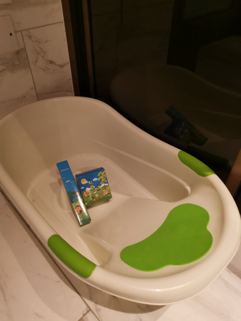 Laughed when I saw this. The tub is too small for our girl. But I appreciate the kids toiletries.