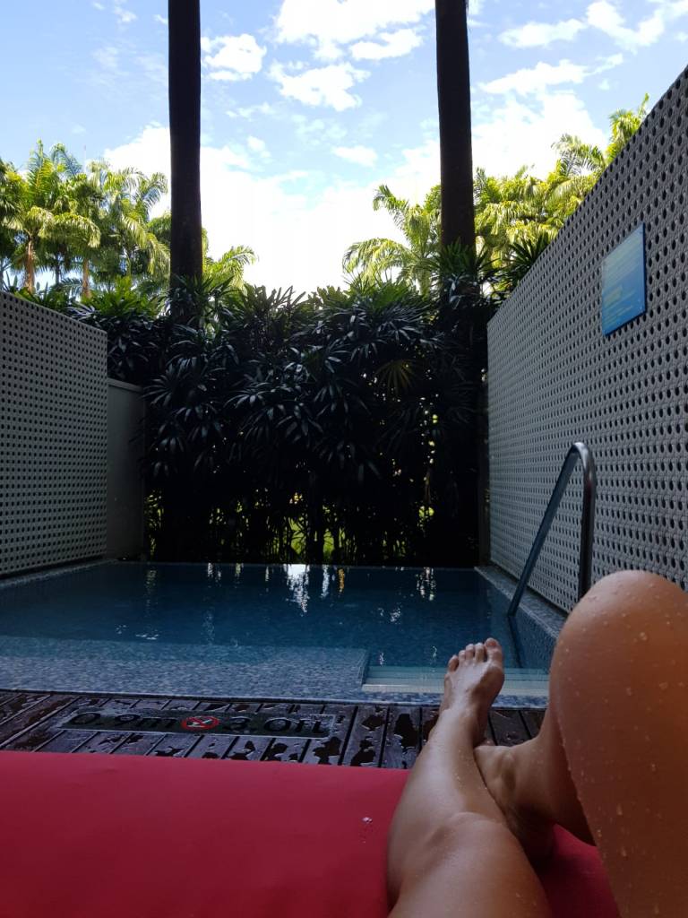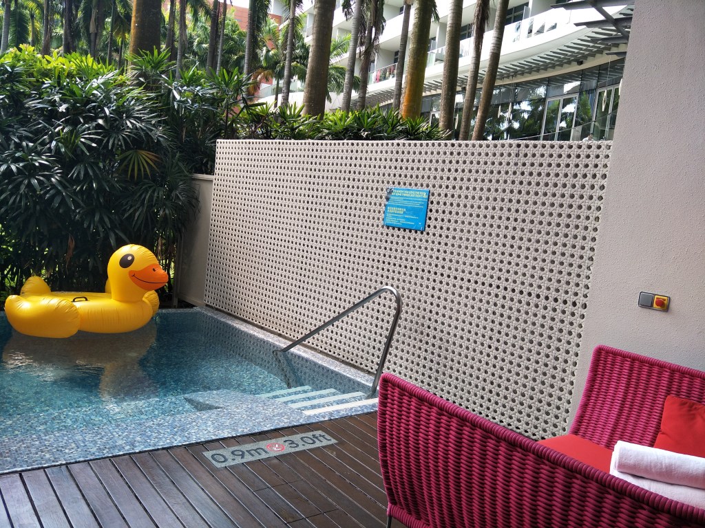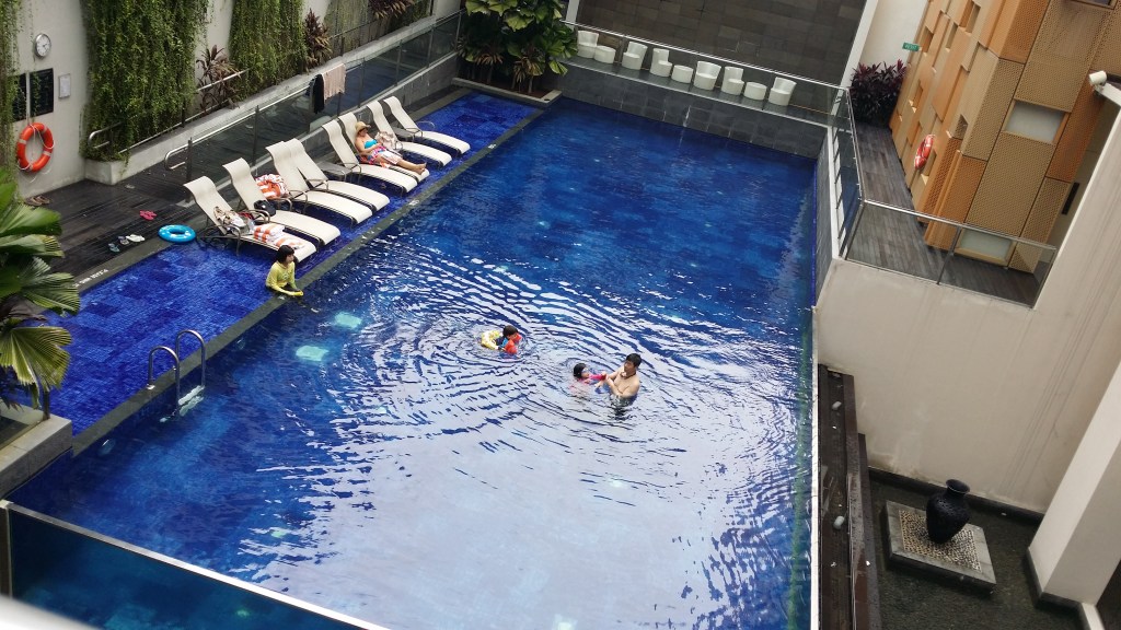 That night after dinner, we received an envelop and fruit platter from the hotel. Although I believe they do this for all guests, I still think it’s a very thoughtful gesture when they address guests by their names! We also visited their hotel pool, something we wouldn’t miss doing whenever we go for our staycation! It’s a regular shaped pool, nothing very fanciful. But I remember seeing round inflated balls floating around the pool. So we have fun throwing the balls to the kids who were sharing the pool with us!
